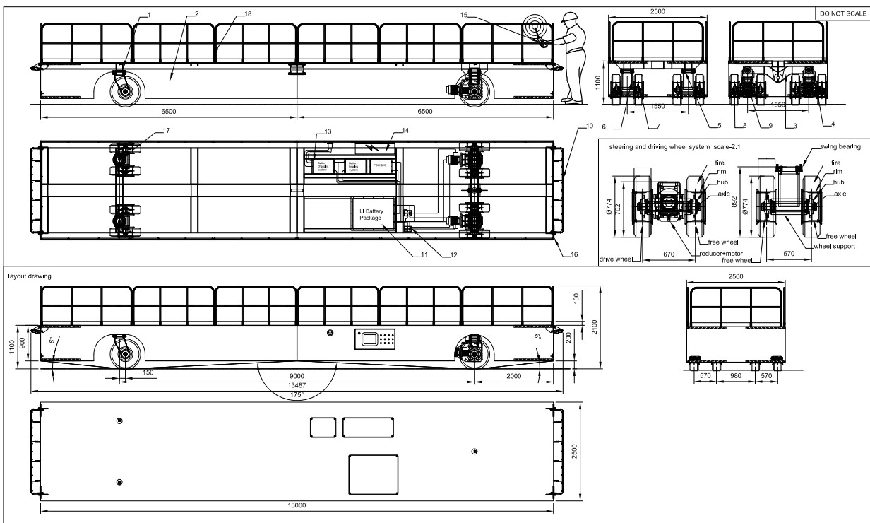 Телега производственная самоходная 24 тонны AGV Описание на колесную тележку: Грузоподъемность: 24 тонны 1 поворотная ость (максимальный угол поворота) Рабочий диапазон температур: -20/+40 С Постоянная работа на улице под открытым небом, перевозки склад-склад до 500м Дорожное покрытие: асфальт, бе… Читать дальшетон (зимой может быть припорошен снегом) Возможность работы в условиях атмосферных осадков (дождь/снег) Габариты платформы: 13 000 мм х 2 500 мм Скорость платформы до 30 м/мин (плавный пуск и торможение) Управление с джойстикового р/пульта+резервный п/у на кабеле (предусмотреть возможность подачи гудка с обоих пультов в случае опасности на пути следования тележки) Литиевый АКБ на 6 ч непрерывной работы+ зарядное устройство Датчики против столкновений, светозвуковая сигнализация Проушины для стропил Ограждения (борта) по периметру исключающие падение груза Защитный бампер (опционально) Дополнительно: - запасной АКБ - ЗИП на быстроизнашиваемые детали